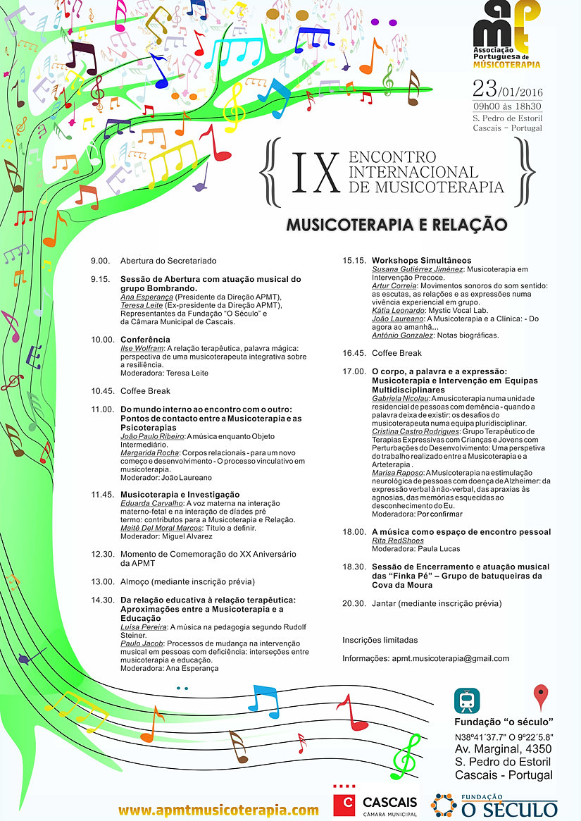 A Associação Portuguesa de Musicoterapia vai realizar o IX Encontro Internacional de Musicoterapia dedicado ao tema “Musicoterapia e Relação”, que irá decorrer dia 23 de Janeiro de 2016 em Cascais.